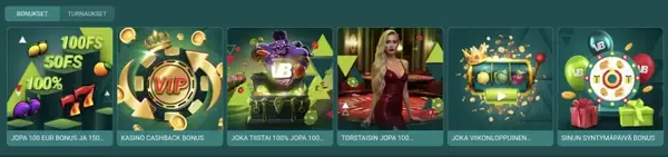 | Tervetuliaisbonus | 1. talletus: 100 % jopa €100 (min €10, 35x kierrätys) |