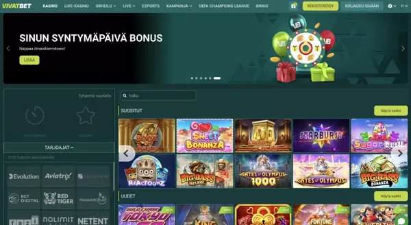 Monet pelaajat pitävät Vivatbet-kasinosta Suomessa sen käytännöllisyydestä: talletukset alkavat 10 eurosta, Trustly-kotiutukset voivat olla nopeita ja pelitiedoissa näkyvät avainasiat, kuten RTP, jokaisen pelin sisällä. Saat myös suodattimet peluntarjoajille ja kategorioille sekä live-chatin, kun tarvitset apua. Kirjastossamme on noin 5 000 peliä kolikkopeleistä live-kasinon ja pöytäpelien kautta jackpoteihin, crash-peleihin, bingoon ja raaputusarpoihin.