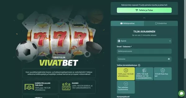 Pelaajille, jotka käyttävät myös vedonlyöntiämme, tarjoamme urheilun tervetuliaismatchin jopa €100 sekä riskittömän vedon vaihtoehdon kelvollisiin ennen ottelua pelattaviin 1X2-vetoihin. Jos näet viestin Vivatbet-kasinon talletuksetonta bonusta koskien, varmista se tilisi kampanjasivulta ennen osallistumista. Vivatbet-bonus kannattaa aina varmistaa sieltä, ei kolmansien osapuolten julkaisuista.