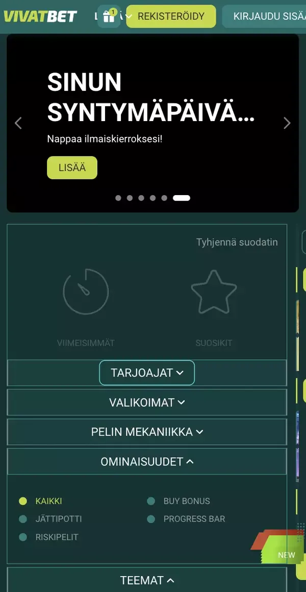 Onko koko mobiilipelikirjasto saatavilla? Kyllä, pääset mobiilissa samoihin kategorioihin kuin pöytäkoneella, mukaan lukien kolikkopelit, Live Casino ja jackpotit Vivatbet Casino -palvelussa.